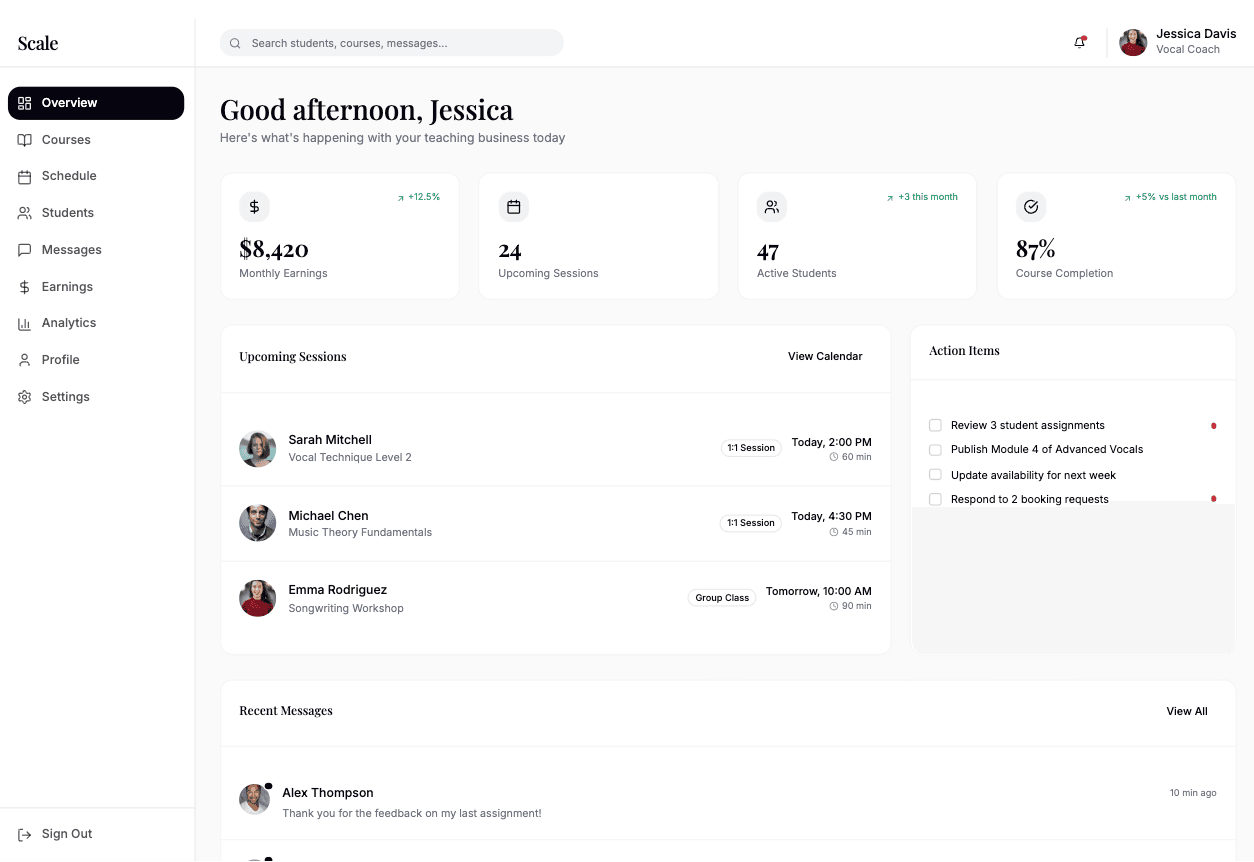 Teachers manage availability, pricing, students, courses, and payments through a single system.