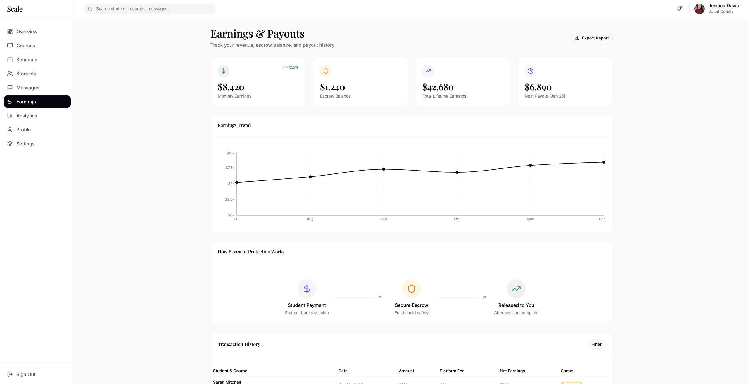 Teachers can monitor payments, view balance, and track payout analytics